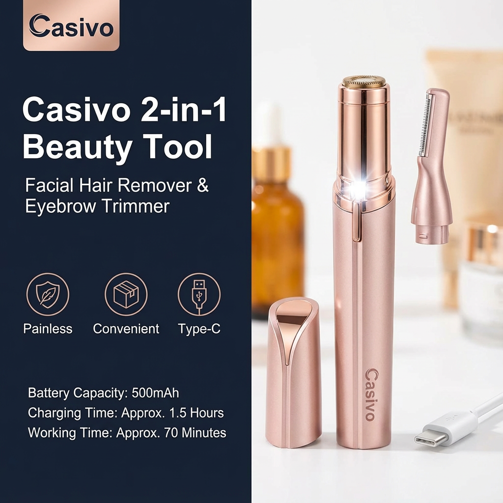 Casivo 2-in-1 Electric Facial Hair Remover & Eyebrow Trimmer, Rechargeable with LED Light – Rose Gold